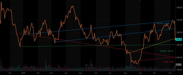 - The stock has dropped over 15 points from its recent highs, and we think there will be support just under $150, a level we find compelling.