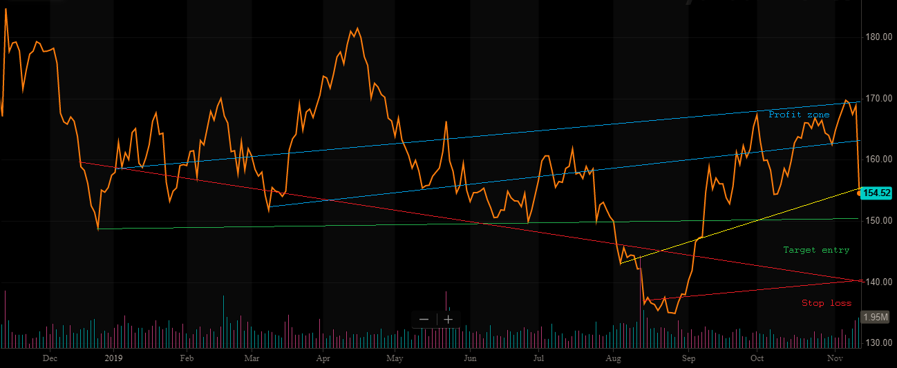 We see an opportunity between $140 and $150 to scoop up some shares. These are the levels we suggest a buy at. We will keep a tight stop on this one and look to scalp some gains. If you opt to play options here we would either sell puts to raise some cash or do a longer dated call, given the somewhat tight range of the stock.